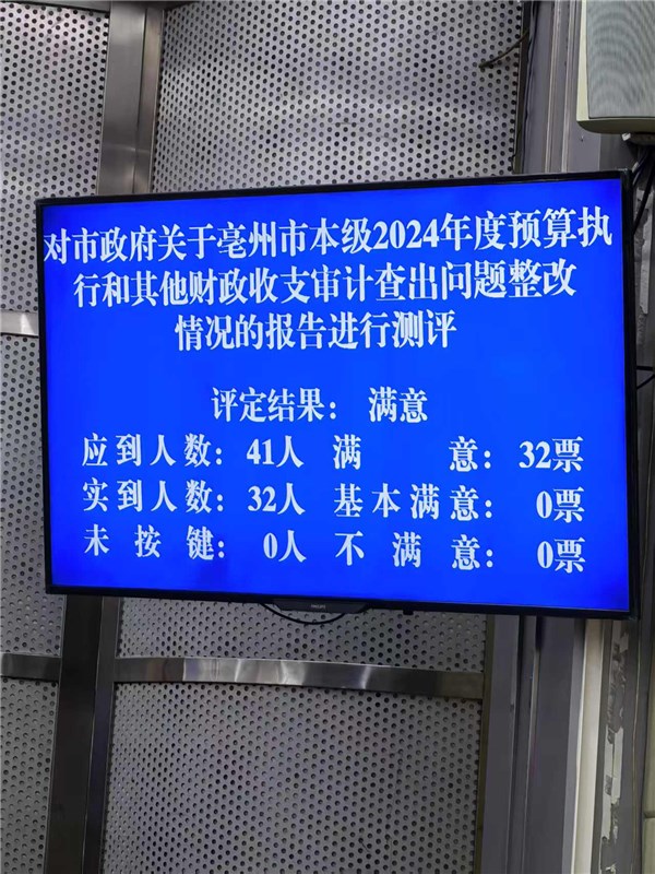 12月30日,亳州市召开第五届人大常委会第三十八次会议,听取并审议了《亳州市2024年度市级预算执行和其他财政收支审计查出问题整改情况的报告》。市人大常委会对该报告给予高度评价和充分肯定,并在满意度测评中获得全部满意票通过。